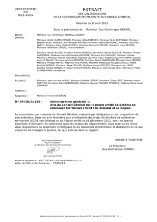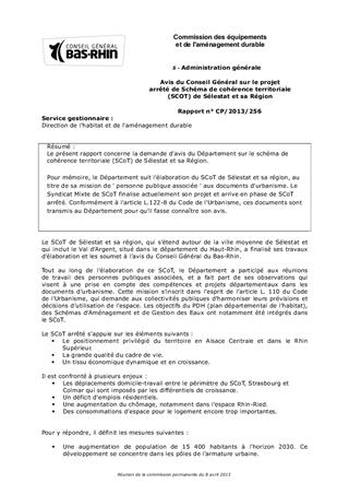 Avis du Conseil Général sur le projet arrêté de Schéma de cohérence territoriale (SCOT) de Sélestat et sa Région