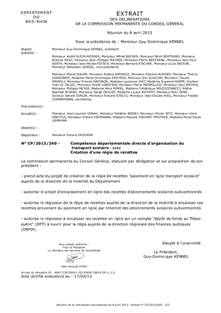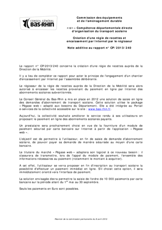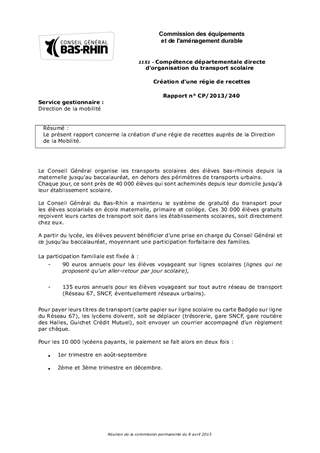 Création d'une régie de recettes Resumé Le présent rapport concerne la création d'une régie de recettes auprès de la Direction de la Mobilité. Pièces jointes Délibération Rapport Note additive rapport CP.2013.240.pdf Assemblée : Commission Permanente Date : 08/04/2013 Rapporteur : Monsieur Francis GRIGNON Collectivité : Conseil départemental du Bas-Rhin Direction : Pôle aménagement du territoire Service : Direction de la mobilité Domaine : Non renseigné Commission : I - Commission des équipements et de l'aménagement durable