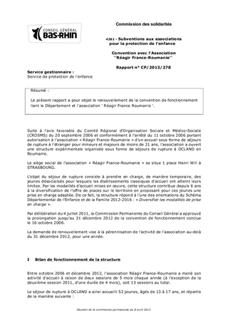 Le présent rapport a pour objet le renouvellement de la convention de fonctionnement liant le Département et l'association ' Réagir France Roumanie '.