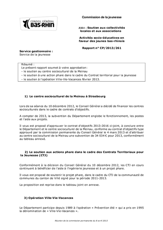 Le présent rapport soumet à votre approbation: - le soutien au centre socioculturel de la Meinau - le soutien à une action phare dans le cadre du Contrat territorial pour la jeunesse - le soutien à l'opération Ville-Vie-Vacances février 2013.