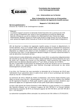 Le présent rapport concerne la demande d'aide financière de la commune de Villé pour la mise à disposition par vente à l'euro symbolique au profit de Habitat des Salariés d'Alsace en vue de la création d'un Etablissement pour Personnes Agées Dépendantes (EHPAD) financé en PLUS (prêt locatif à usage social) et d'une résidence pour personnes âgées (RPA) financée en PLUS et PLAI (prêt locatif aidé d'intégration).