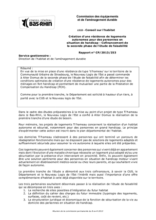 En vue de la mise en place d'une résidence de type 'ti'hameau' sur le territoire de la Communauté Urbaine de Strasbourg, le Nouveau Logis de l'Est a passé commande à Alter Domus de la seconde phase de l'étude de faisabilité afin de déterminer les conditions optimales de création d'une résidence de logements autonomes pour des ménages en fort handicap et permettant de mutualiser une partie de la Prestation de Compensation du Handicap (PCH). Comme pour la première tranche, le Département est sollicité à hauteur d'un tiers, à parité avec la CUS et le Nouveau logis de l'Est.