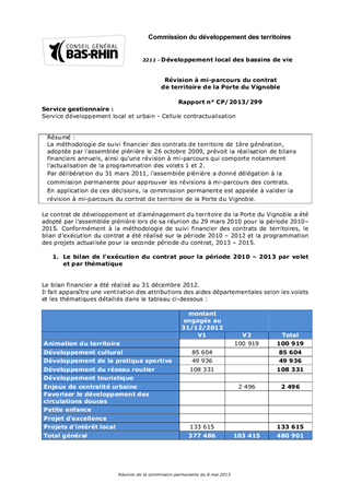 La méthodologie de suivi financier des contrats de territoire de 1ère génération, adoptée par l'assemblée plénière le 26 octobre 2009, prévoit la réalisation de bilans financiers annuels, ainsi qu'une révision à mi-parcours qui comporte notamment l'actualisation de la programmation des volets 1 et 2. Par délibération du 31 mars 2011, l'assemblée plénière a donné délégation à la commission permanente pour approuver les révisions à mi-parcours des contrats. En application de ces décisions, la commission permanente est appelée à valider la révision à mi-parcours du contrat de territoire de la Porte du Vignoble.