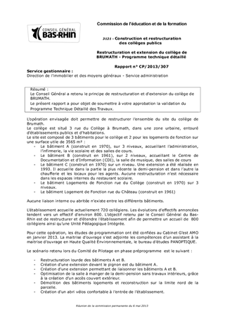Le Conseil Général a retenu le principe de restructuration et d'extension du collège de BRUMATH. Le présent rapport a pour objet de soumettre à votre approbation la validation du Programme Technique Détaillé des Travaux.