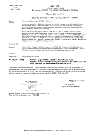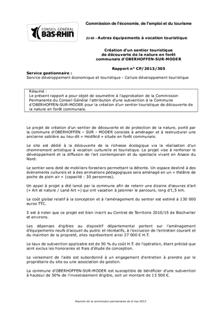 Le présent rapport a pour objet de soumettre à l'approbation de la Commission Permanente du Conseil Général l'attribution d'une subvention à la Commune d'OBERHOFFEN-SUR-MODER pour la création d'un sentier touristique de découverte de la nature en forêt communale.