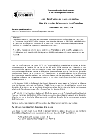 Le présent rapport concerne les demandes d'aide financière présentées par OPUS 67, la Commune de HERBITZHEIM, Habitat des Salariés d'Alsace et ERSTEIN HABITAT dans le cadre de la délégation des aides à la pierre de l'Etat et du dispositif départemental d'aide à la création de logements locatifs très sociaux. A ce titre, 4 dossiers relatifs à des opérations financées en prêt locatif à usage social (PLUS) et en prêt locatif aidé d'intégration (PLAI) sont présentés dans les annexes au rapport.