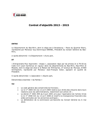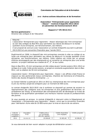 L'association 'Entreprendre pour Apprendre - Alsace' développe des 'mini-entreprises' au sein des collèges du Bas-Rhin pour permettre aux élèves de découvrir le monde quotidien d'une entreprise, son fonctionnement, ses métiers. Il est proposé de conclure avec l'association un contrat d'objectifs couvrant la période 2013-2015 et une convention financière pour l'année 2013.