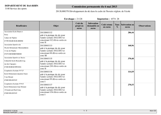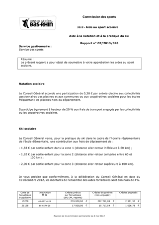 Aide à la natation et à la pratique du ski Resumé Le présent rapport a pour objet de soumettre à votre approbation les aides au sport scolaire. Pièces jointes Délibération Rapport 3313 Natation scolaire communes.pdf 3313 Ski scolaire Associations.pdf Assemblée : Commission Permanente Date : 06/05/2013 Rapporteur : Monsieur Sébastien ZAEGEL Collectivité : Conseil départemental du Bas-Rhin Direction : Direction de la jeunesse et des sports Service : Service des sports Domaine : Non renseigné Commission : L - Commission des sports