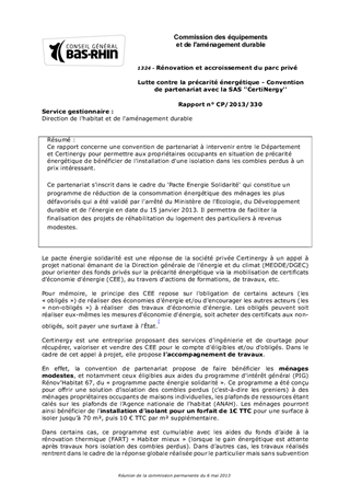 Ce rapport concerne une convention de partenariat à intervenir entre le Département et Certinergy pour permettre aux propriétaires occupants en situation de précarité énergétique de bénéficier de l'installation d'une isolation dans les combles perdus à un prix intéressant. Ce partenariat s'inscrit dans le cadre du 'Pacte Energie Solidarité' qui constitue un programme de réduction de la consommation énergétique des ménages les plus défavorisés qui a été validé par l'arrêté du Ministère de l'Ecologie, du Développement durable et de l'énergie en date du 15 janvier 2013. Il permettra de faciliter la finalisation des projets de réhabilitation du logement des particuliers à revenus modestes.