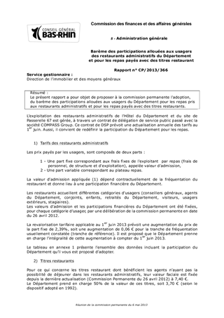 Le présent rapport a pour objet de proposer à la commission permanente l'adoption, du barème des participations allouées aux usagers du Département pour les repas pris aux restaurants administratifs et pour les repas payés avec des titres restaurants.
