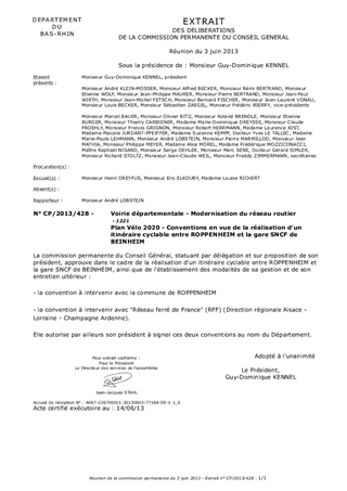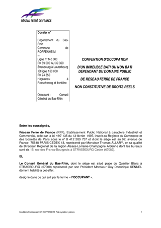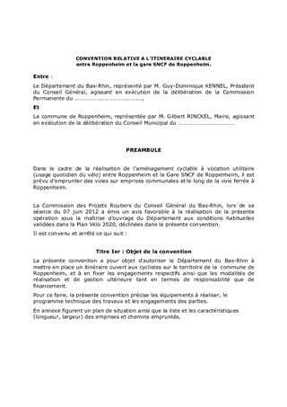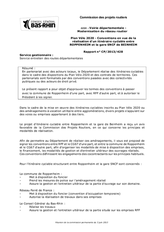 En partenariat avec des acteurs locaux, le Département réalise des itinéraires cyclables dans le cadre des dispositions du Plan Vélo 2020 et des contrats de territoires. Ces partenariats sont formalisés par des conventions passées avec des collectivités publiques ou des acteurs de droit privé. Le présent rapport a pour objet d'approuver les termes des conventions à passer avec la commune de Roppenheim d'une part, avec RFF d'autre part, et à autoriser le Président à les signer.