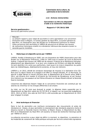 Le présent rapport a pour objet de soumettre à votre approbation une convention financière entre la Région, le Conseil général du Haut-Rhin, le Conseil général du Bas-Rhin, et l'Association pour des Etudes sur la Résistance Intérieure en Alsace. Cette convention doit permettre à l'AERIA de poursuivre et diffuser ses travaux de recherches historiques relatifs à la résistance intérieure des alsaciens durant la seconde guerre mondiale.