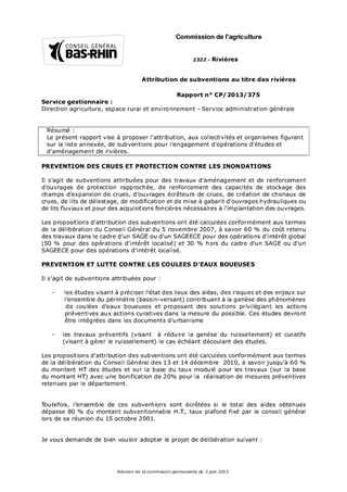 Le présent rapport vise à proposer l'attribution, aux collectivités et organismes figurant sur la liste annexée, de subventions pour l'engagement d'opérations d'études et d'aménagement de rivières.