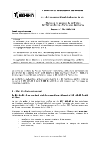 La méthodologie actuelle de suivi financier des contrats de territoire, adoptée par l'assemblée plénière le 26 octobre 2009, prévoit la réalisation de bilans financiers annuels, ainsi qu'une révision à mi-parcours qui comporte notamment l'actualisation de la programmation des volets 1 et 2. Par délibération du 31 mars 2011, l'assemblée plénière a donné délégation à la commission permanente pour approuver les révisions à mi-parcours des contrats. En application de ces décisions, la commission permanente est appelée à valider la révision à mi-parcours du contrat de territoire du Pays de Marmoutier-Sommerau.