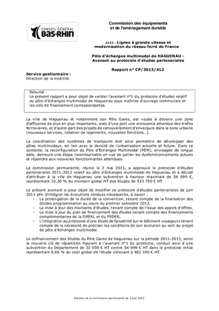 Le présent rapport a pour objet de valider l'avenant n°1 du protocole d'études relatif au pôle d'échanges multimodal de Haguenau sous maîtrise d'ouvrage communale et les clés de financement correspondantes.