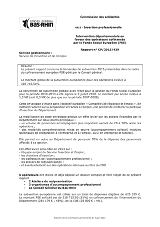Le présent rapport concerne 6 demandes de subvention 2013 présentées dans le cadre du cofinancement européen FSE géré par le Conseil général. Le montant global de la subvention européenne pour ces opérations s'élève à 318 715,50 €.