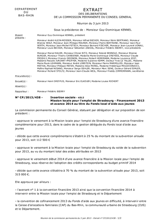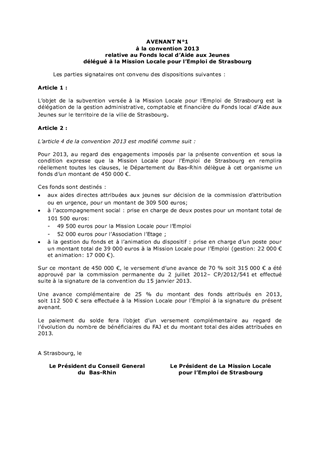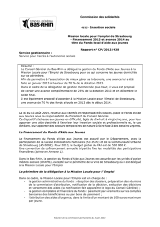 Le Conseil Général du Bas-Rhin a délégué la gestion du Fonds d'Aide aux Jeunes à la Mission Locale pour l'Emploi de Strasbourg pour ce qui concerne les jeunes domiciliés sur ce périmètre. Afin de permettre à l'association de mieux gérer sa trésorerie, une avance lui a été faite en janvier 2013 à hauteur de 70 % de la dotation 2013. Dans le cadre de la délégation de gestion mentionnée plus haut, il vous est proposé de verser une avance complémentaire de 25% de la dotation 2013 et en décembre le solde final. Il est également proposé d'accorder à la Mission Locale pour l'Emploi de Strasbourg, une avance de 70 % des fonds alloués en 2013 dès le début 2014.