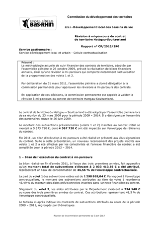 La méthodologie actuelle de suivi financier des contrats de territoire, adoptée par l'assemblée plénière le 26 octobre 2009, prévoit la réalisation de bilans financiers annuels, ainsi qu'une révision à mi-parcours qui comporte notamment l'actualisation de la programmation des volets 1 et 2. Par délibération du 31 mars 2011, l'assemblée plénière a donné délégation à la commission permanente pour approuver les révisions à mi-parcours des contrats. En application de ces décisions, la commission permanente est appelée à valider la révision à mi-parcours du contrat de territoire Hattgau-Soultzerland.