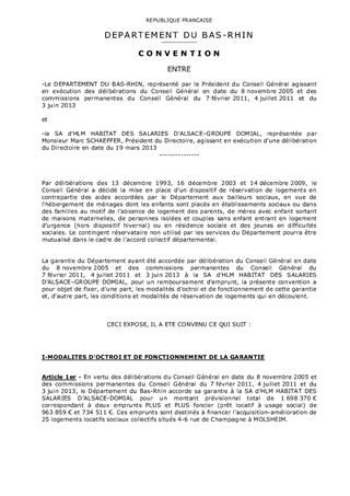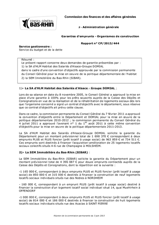 Le présent rapport concerne deux demandes de garantie présentées par : 1) la SA d'HLM Habitat des Salariés d'Alsace-Groupe DOMIAL dans le cadre d'une convention d'objectifs approuvée par la commission permanente du Conseil Général pour la mise en oeuvre de la politique départementale de l'habitat 2) la SEM Immobilière du Bas-Rhin (SIBAR).