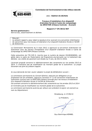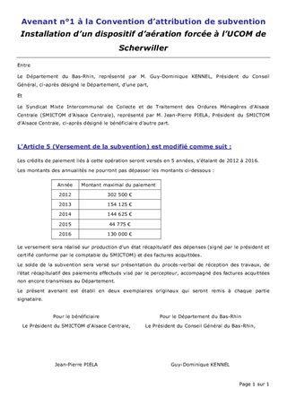 Le présent rapport a pour objet la signature d'un avenant à la convention d'attribution de subvention pour les travaux d'installation d'un dispositif d'aération forcée à l'UCOM de Scherwiller.