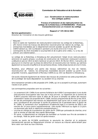 Dans le cadre de l'opération de restructuration-extension du collège de la Robertsau, afin mener à bien les travaux de démolition reconstruction de l'atelier du collège, les entreprises mandatées par le département doivent accéder au jardin de Monsieur CAEN habitant au 103 rue Boecklin pendant une durée d'environ 4 mois. En contrepartie du droit d'accéder à sa propriété et de la gêne ainsi créée, il y a lieu de prévoir une indemnisation.