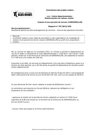 Le présent rapport a pour objet de soumettre à votre approbation les modalités de cession d'une parcelle de terrain située à GRESSWILLER au profit d'un propriétaire riverain.