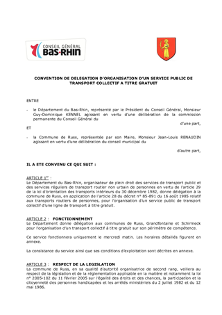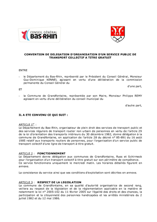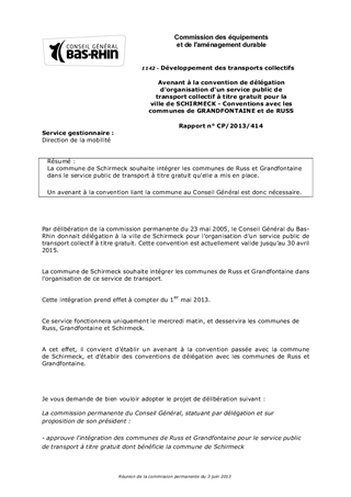 La commune de Schirmeck souhaite intégrer les communes de Russ et Grandfontaine dans le service public de transport à titre gratuit qu'elle a mis en place. Un avenant à la convention liant la commune au Conseil Général est donc nécessaire.