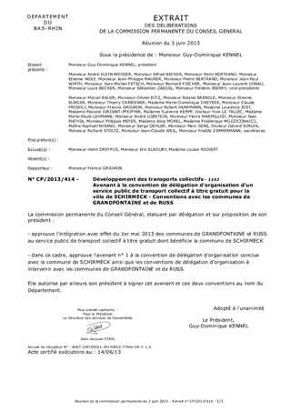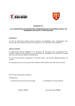Avenant à la convention de délégation d'organisation d'un service public de transport collectif à titre gratuit pour la ville de SCHIRMECK - Conventions avec les communes de GRANDFONTAINE et de RUSS