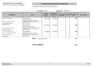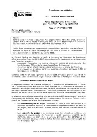 Dans le cadre de la mise en oeuvre du Plan Départemental d'Insertion (PDI), le Conseil Général du Bas-Rhin a décidé de créer, dès 2011, un Fonds départemental d'Innovation pour l'Insertion. Ce fonds s'élève à 145 000 € pour l'année 2013. L'objet de ce rapport est de vous soumettre pour décision les projets retenus à l'appel à projets 2013 par le Comité de pilotage qui s'est réuni le 25 avril 2013 et examinés par la Commission des Solidarités du 16 mai 2013.