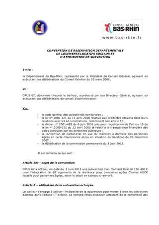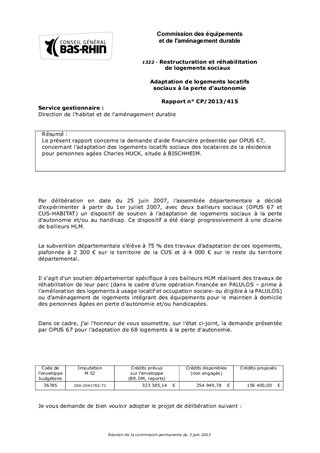 Le présent rapport concerne la demande d'aide financière présentée par OPUS 67, concernant l'adaptation des logements locatifs sociaux des locataires de la résidence pour personnes agées Charles HUCK, située à BISCHHEIM.