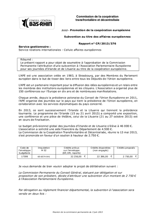 Le présent rapport a pour objet de soumettre à l'approbation de la Commission Permanente l'attribution d'une subvention à l'Association Parlementaire Européenne pour ses journées d'Irlande et de Lituanie au titre de la coopération européenne.