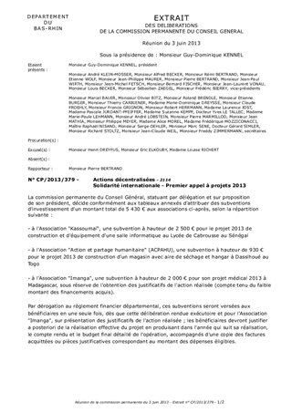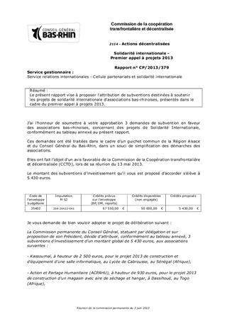 Le présent rapport vise à proposer l'attribution de subventions destinées à soutenir les projets de solidarité internationale d'associations bas-rhinoises, présentés dans le cadre du premier appel à projets 2013.