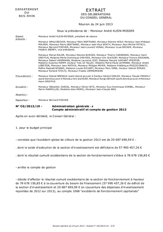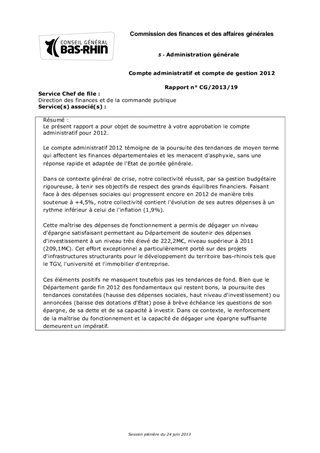 Le présent rapport a pour objet de soumettre à votre approbation le compte administratif pour 2012. Le compte administratif 2012 témoigne de la poursuite des tendances de moyen terme qui affectent les finances départementales et les menacent d'asphyxie, sans une réponse rapide et adaptée de l'Etat de portée générale. Dans ce contexte général de crise, notre collectivité réussit, par sa gestion budgétaire rigoureuse, à tenir ses objectifs de respect des grands équilibres financiers. Faisant face à des dépenses sociales qui progressent encore en 2012 de manière très soutenue à +4,5%, notre collectivité contient l'évolution de ses autres dépenses à un rythme inférieur à celui de l'inflation (1,9%). Cette maîtrise des dépenses de fonctionnement a permis de dégager un niveau d'épargne satisfaisant permettant au Département de soutenir des dépenses d'investissement à un niveau très élevé de 222,2M€, niveau supérieur à 2011 (209,1M€). Cet effort exceptionnel a particulièrement porté sur des projets d'infrastructures structurants pour le développement du territoire bas-rhinois tels que le TGV, l'université et l'immobilier d'entreprise. Ces éléments positifs ne masquent toutefois pas les tendances de fond. Bien que le Département garde fin 2012 des fondamentaux qui restent bons, la poursuite des tendances constatées (hausse des dépenses sociales, haut niveau d'investissement) ou annoncées (baisse des dotations d'Etat) pose à brève échéance les questions de son épargne, de sa dette et de sa capacité à investir. Dans ce contexte, le renforcement de la maîtrise du fonctionnement et la capacité de dégager une épargne suffisante demeurent un impératif.