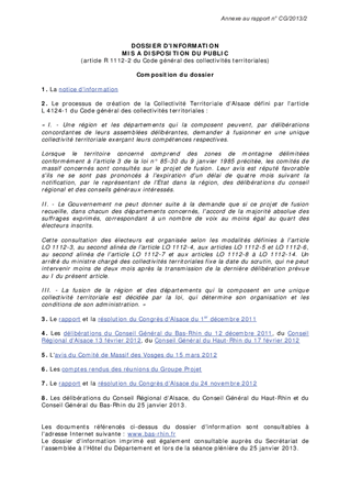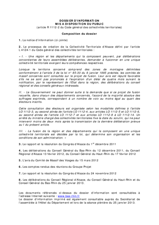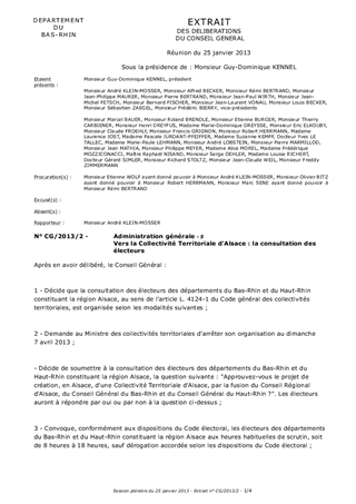 A la suite de la délibération du Conseil Général du Bas-Rhin concernant l'approbation de la résolution du Congrès d'Alsace du 24 novembre 2012 et pour poursuivre le processus de création de la Collectivité Territoriale d'Alsace, il est proposé : - d'approuver la question qui sera posée aux électeurs lors de la consultation ; - d'engager le processus de consultation des électeurs prévu par la loi, de proposer de fixer la date de la consultation des électeurs au 7 avril 2013 ainsi que de convoquer les électeurs ; - de définir les modalités d'organisation de la consultation des électeurs ; - de définir les modalités de participation des groupes d'élus, les groupements et partis politiques habilités à la consultation des électeurs.