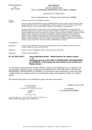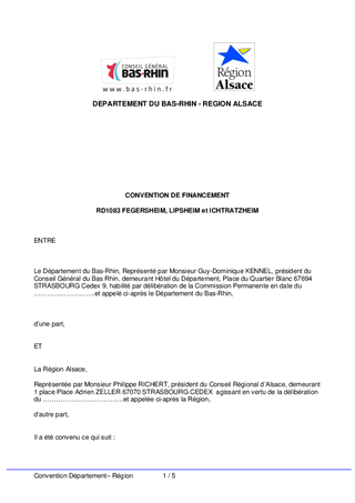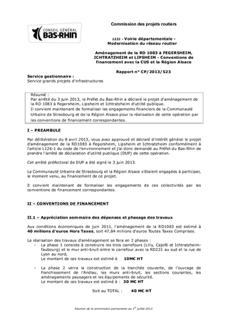 Par arrêté du 3 juin 2013, le Préfet du Bas-Rhin a déclaré le projet d'aménagement de la RD 1083 à Fegersheim, Lipsheim et Ichtratzheim d'utilité publique. Il convient maintenant de formaliser les engagements financiers de la Communauté Urbaine de Strasbourg et de la Région Alsace pour la réalisation de cette opération par les conventions de financement correspondantes.