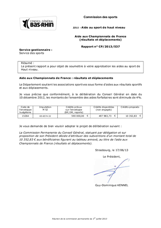Le présent rapport a pour objet de soumettre à votre approbation les aides au sport de Haut niveau.