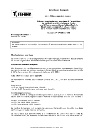 Le présent rapport a pour objet de soumettre à votre approbation les aides au sport de masse.