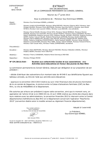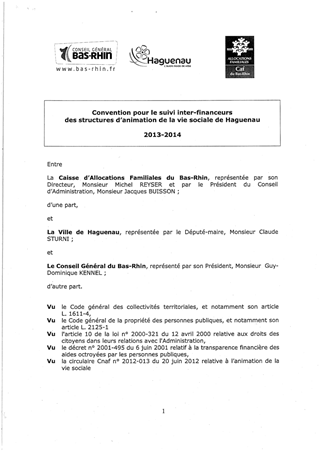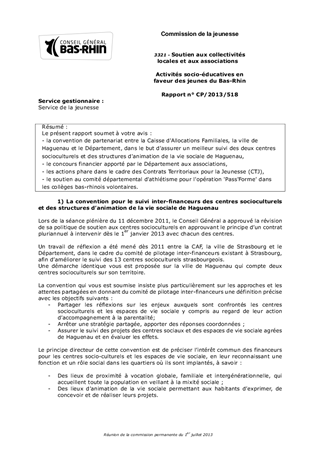 Le présent rapport soumet à votre avis : - la convention de partenariat entre la Caisse d'Allocations Familiales, la ville de Haguenau et le Département, dans le but d'assurer un meilleur suivi des deux centres socioculturels et des structures d'animation de la vie sociale de Haguenau, - le concours financier apporté par le Département aux associations, - les actions phare dans le cadre des Contrats Territoriaux pour la Jeunesse (CTJ), - le soutien au comité départemental d'athlétisme pour l'opération 'Pass'Forme' dans les collèges bas-rhinois volontaires.