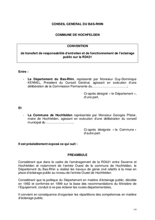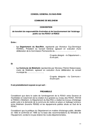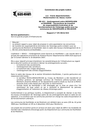 Le présent rapport a pour objet de proposer à votre approbation les conventions de transfert de responsabilité et d'entretien de l'éclairage public à établir avec les communes de Melsheim et Hochfelden dans le cadre des travaux d'aménagement de la RD 421 entre Saverne et Hochfelden.
