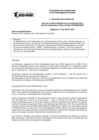 Avis du Conseil Général sur le projet de Plan local d'urbanisme (PLU) arrêté d'ACHENHEIM