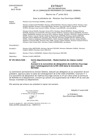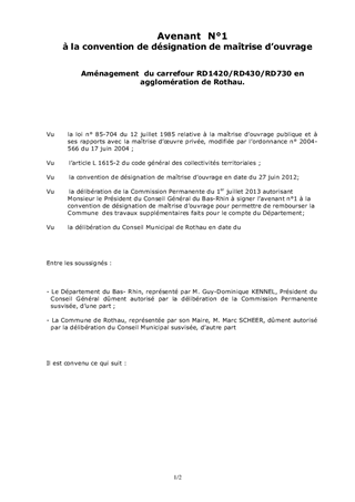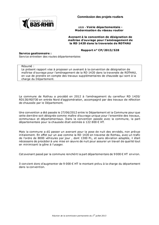 Le présent rapport vise à proposer un avenant à la convention de désignation de maîtrise d'ouvrage pour l'aménagement de la RD 1420 dans la traversée de ROTHAU, en vue de prendre en compte des travaux supplémentaires de chaussée qui sont à la charge du Département.