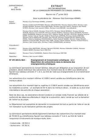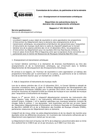 Le présent rapport a pour objet de soumettre à votre approbation les propositions d'intervention du Département dans le domaine des enseignements et de la transmission artistiques, les propositions d'attribution de subventions pour l'acquisition d'instruments de musique neufs dans le cadre du dispositif adopté par le Conseil Général lors de la séance plénière des 12 et 13 décembre 2011, les propositions d'intervention du Département pour les lauréats 2013 du Pass'Jeunes Artistes, la mise en place d'une Ecole Pôle à Haguenau ainsi que la signature d'une convention de partenariat avec le Centre de Ressources de Musiques Actuelles Bas-Rhin Sud.