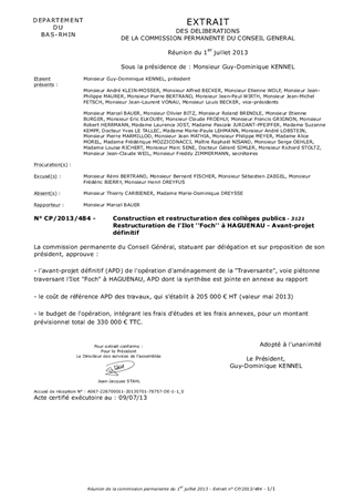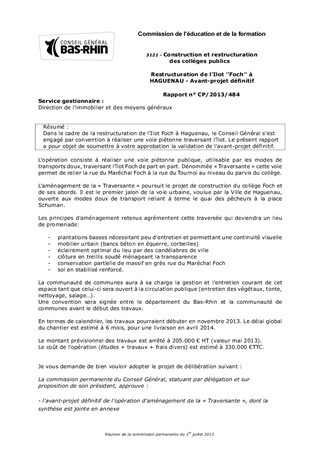 Dans le cadre de la restructuration de l'Ilot Foch à Haguenau, le Conseil Général s'est engagé par convention à réaliser une voie piétonne traversant l'îlot. Le présent rapport a pour objet de soumettre à votre approbation la validation de l'avant-projet définitif.