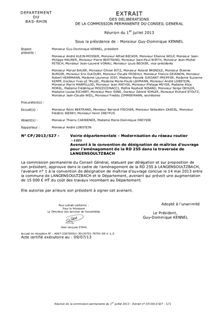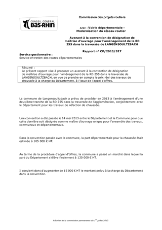 Le présent rapport vise à proposer un avenant à la convention de désignation de maîtrise d'ouvrage pour l'aménagement de la RD 255 dans la traversée de LANGENSOULTZBACH, en vue de prendre en compte le prix réel des travaux de chaussée à la charge du Département, à l'issue de l'appel d'offres.