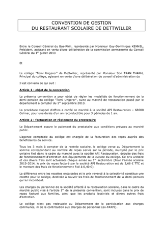 Convention de gestion du restaurant scolaire du collège ''Tomi Ungerer'' à DETTWILLER