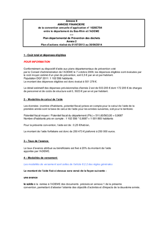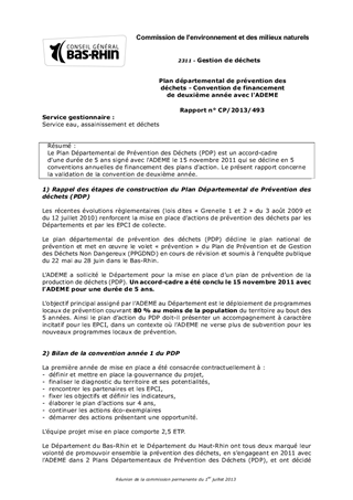 Le Plan Départemental de Prévention des Déchets (PDP) est un accord-cadre d'une durée de 5 ans signé avec l'ADEME le 15 novembre 2011 qui se décline en 5 conventions annuelles de financement des plans d'action. Le présent rapport concerne la validation de la convention de deuxième année.