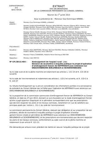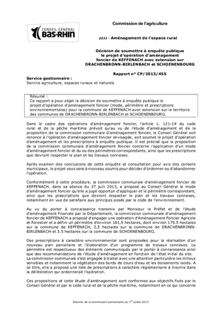 Ce rapport a pour objet la décision de soumettre à enquête publique le projet d'opération d'aménagement foncier (mode, périmètre et prescriptions environnementales) pour la commune de KEFFENACH avec extension sur le territoire des communes de DRACHENBRONN-BIRLENBACH et SCHOENENBOURG.