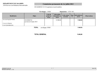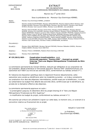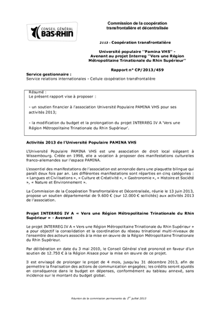 Le présent rapport vise à proposer : - un soutien financier à l'association Université Populaire PAMINA VHS pour ses activités 2013; - la modification du budget et la prolongation du projet INTERREG IV A 'Vers une Région Métropolitaine Trinationale du Rhin Supérieur'.
