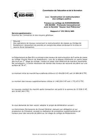 Des opérations de travaux concernant la restructuration de classes au Collège de Niederbronn nécessitent de prendre en compte des aléas conduisant à la mise en oeuvre d'une transaction.