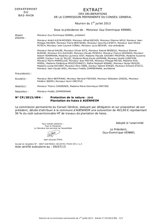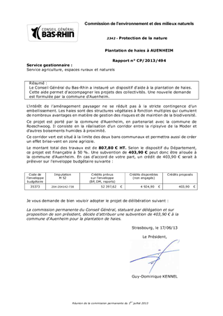Le Conseil Général du Bas-Rhin a instauré un dispositif d'aide à la plantation de haies. Cette aide permet d'accompagner les projets des collectivités. Une nouvelle demande est formulée par la commune d'Auenheim.